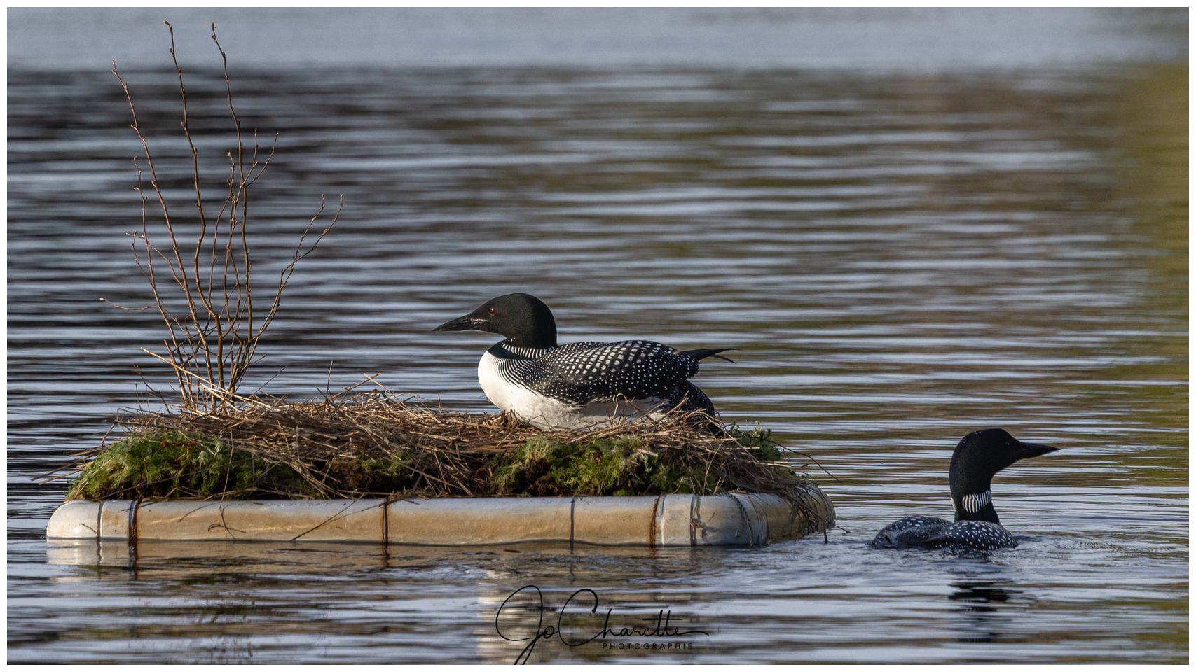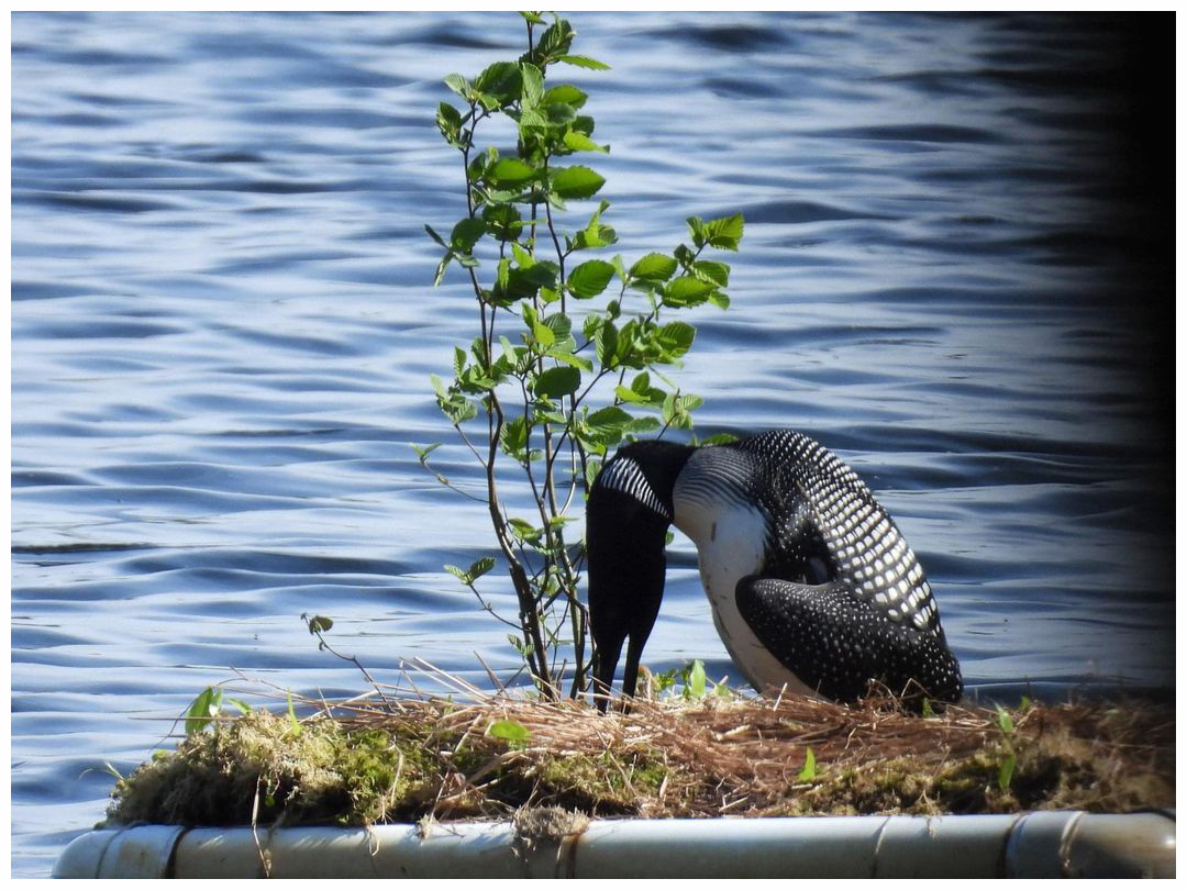 With frequent and often violent summer storms, finding a suitable and safe nesting spot has become a challenge for loons as the male will often select a place on shore very near the water's edge which is vulnerable to flooding and washouts. A local ornithologist guided members of our community in the construction of a floating nest platform which the loons have happily adopted for the past six years.