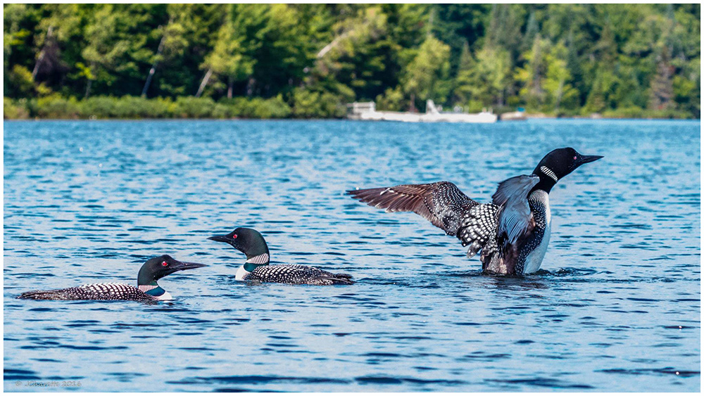Loons usually return to the same lake each year where they have previously established their territory. Although loons keep the same mate for many years they are not wedded. When two mature females arrive at the same lake they engage in a fierce competition of violent wing flapping and an aggressive (but amazing) on water chase called wing rowing which eventually drives one loon away. Have a look at this video clip of a loon wing rowing https://youtu.be/KUI_M4W-eWk. Once the partners are re-established the courtship begins.